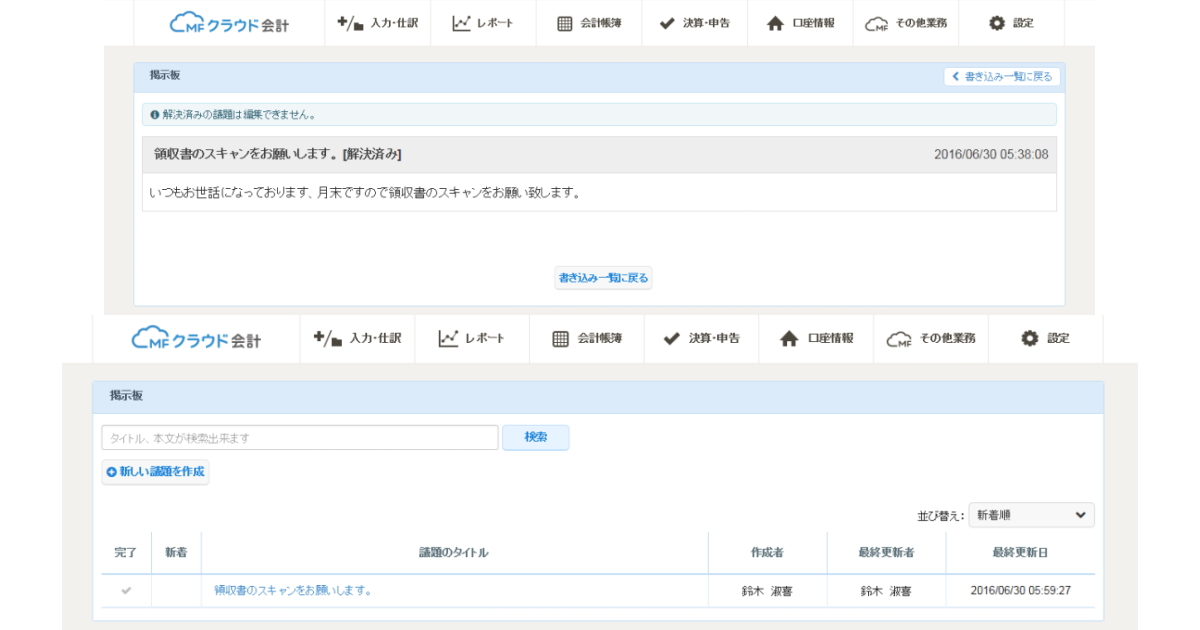 普段のクライアント様とのやり取りは、chatworkがほとんどでしたので、MFクラウド会計の「掲示板」を使ったことがなかったのですが、どんなものか使ってみます。