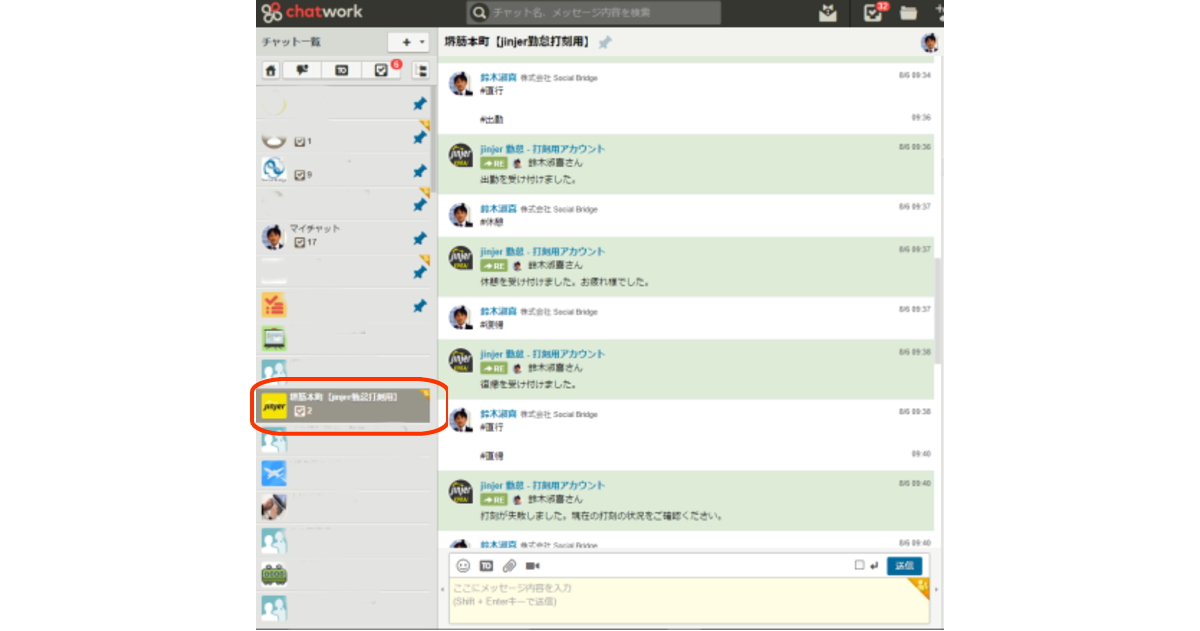 打刻用のグループを作って、jinjer_勤怠-打刻用アカウントと打刻するメンバーを登録するだけで、あとは#出勤や#退勤などで認識されて、自動的にjinjer勤怠へ打刻されます。