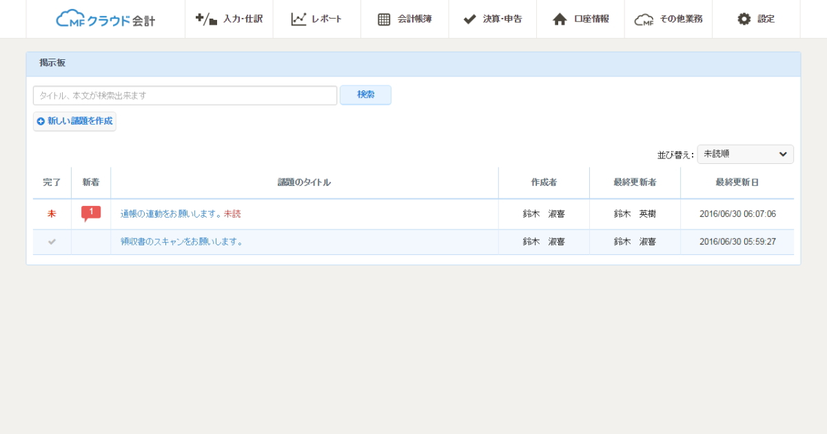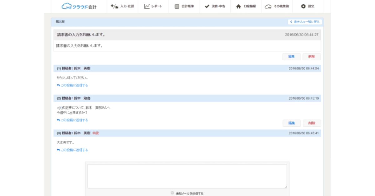 普段のクライアント様とのやり取りは、chatworkがほとんどでしたので、MFクラウド会計の「掲示板」を使ったことがなかったのですが、どんなものか使ってみます。